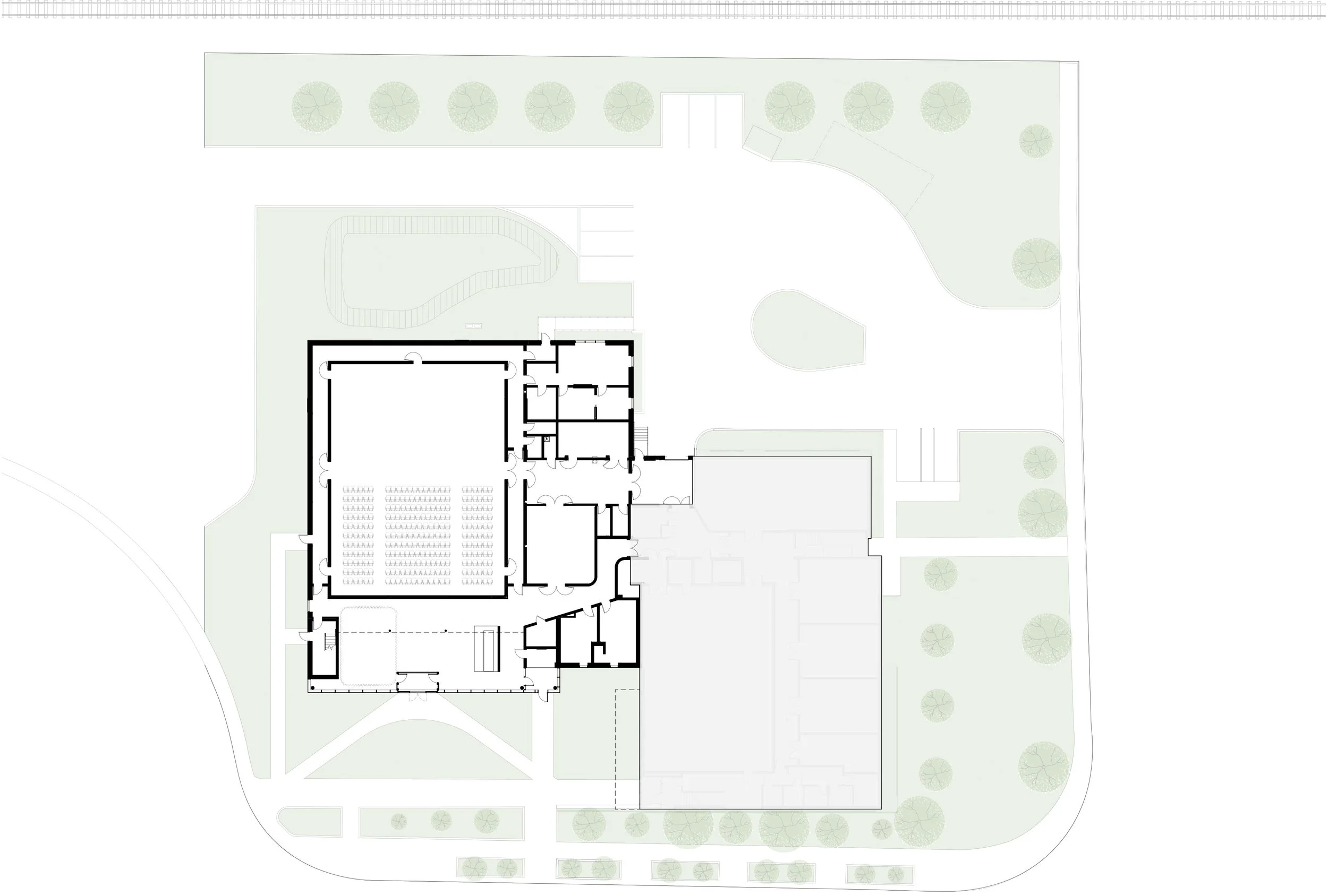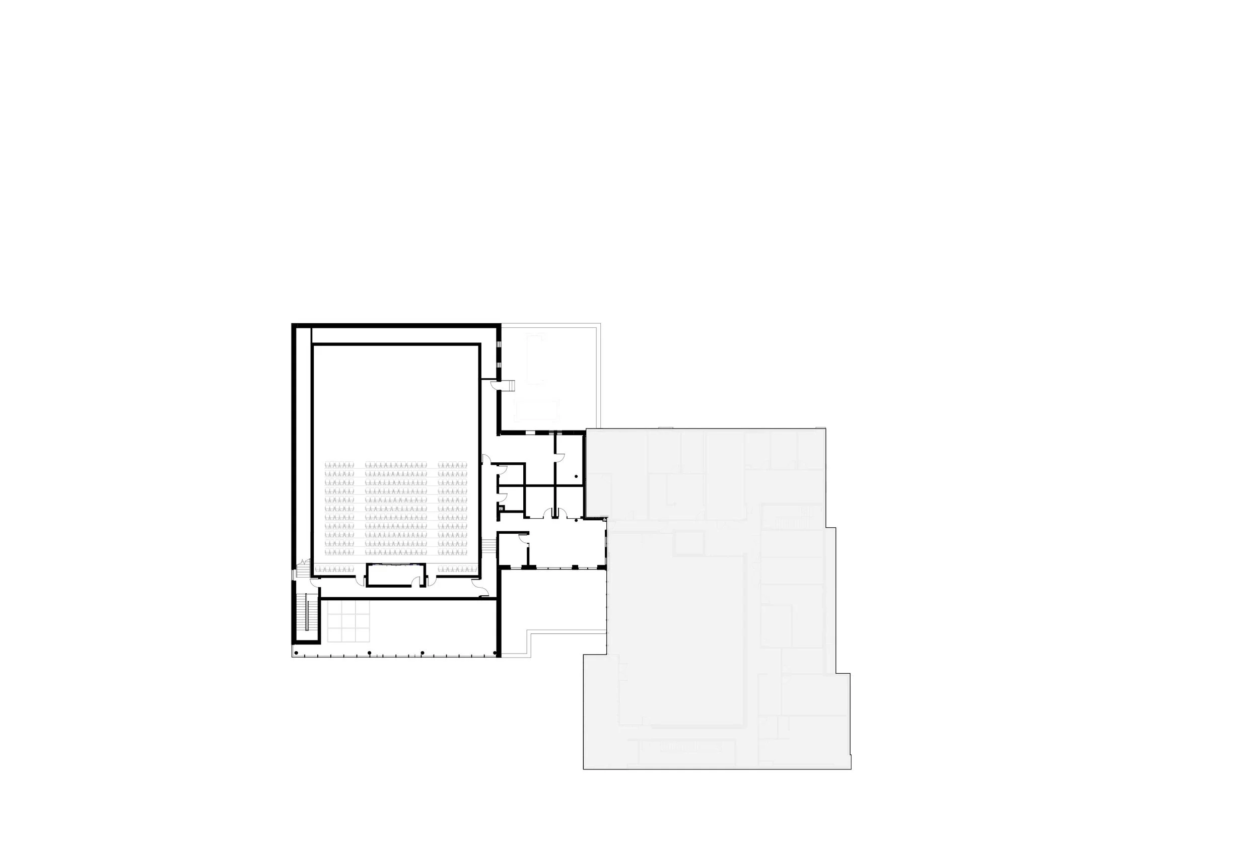 The project brings together administrative offices, a green room with three adjacent dressing rooms for artists, a loading dock area, and storage for equipment, removable seats, and sets.