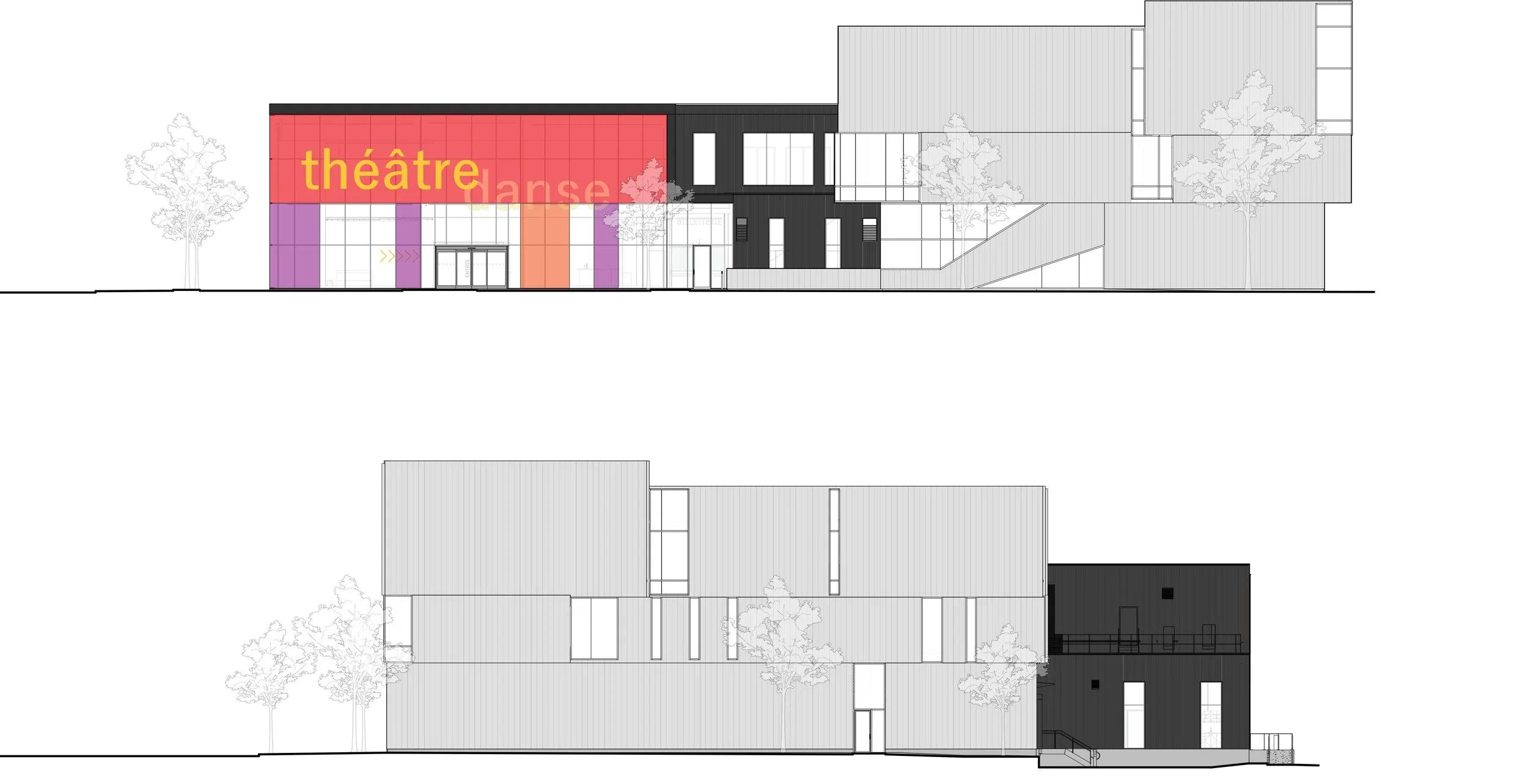 Resulting from a design competition won in 2020, the challenge was to create a theatrical venue with a strong urban presence from a rectangular volume featuring exposed facades on three sides. Color, light, and transparency were orchestrated to transform the black envelope into animated surfaces, alongside a vibrant and welcoming foyer that serves as a true cultural showcase for the city.